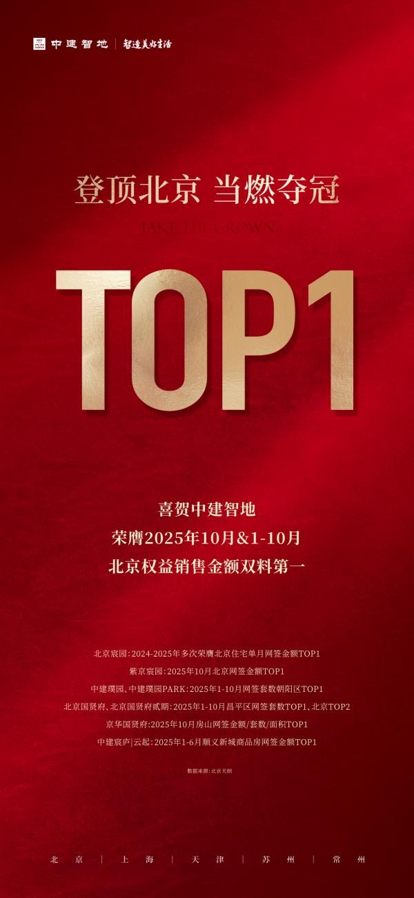 根据第三方机构天朗房研网发布的数据,中建智地凭借其在北京市场的持续深耕,以10月网签金额29亿元、2025年1-10月网签金额达176亿元的不俗业绩,同步登顶北京同期TOP1,稳坐北京楼市头把交椅,热销势头不减。