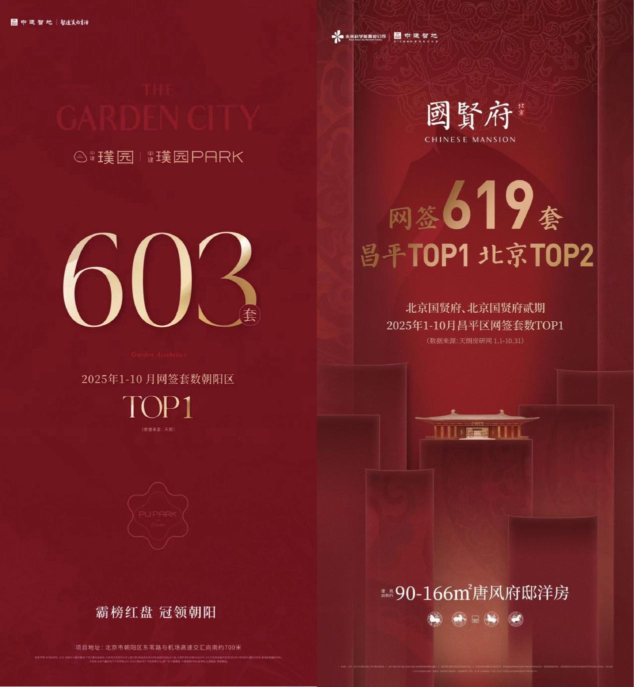 与此同时,其在京各大顺销项目也表现颇佳:中建璞园与中建璞园PARK 2025年1-10月以603套网签套数位居朝阳TOP1;北京国贤府与北京国贤府贰期2025年1-10月以619套网签套数位居昌平区TOP1、北京TOP2,持续领跑朝阳、昌平。