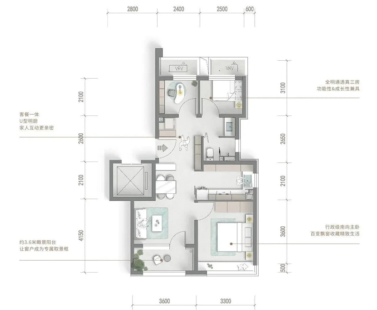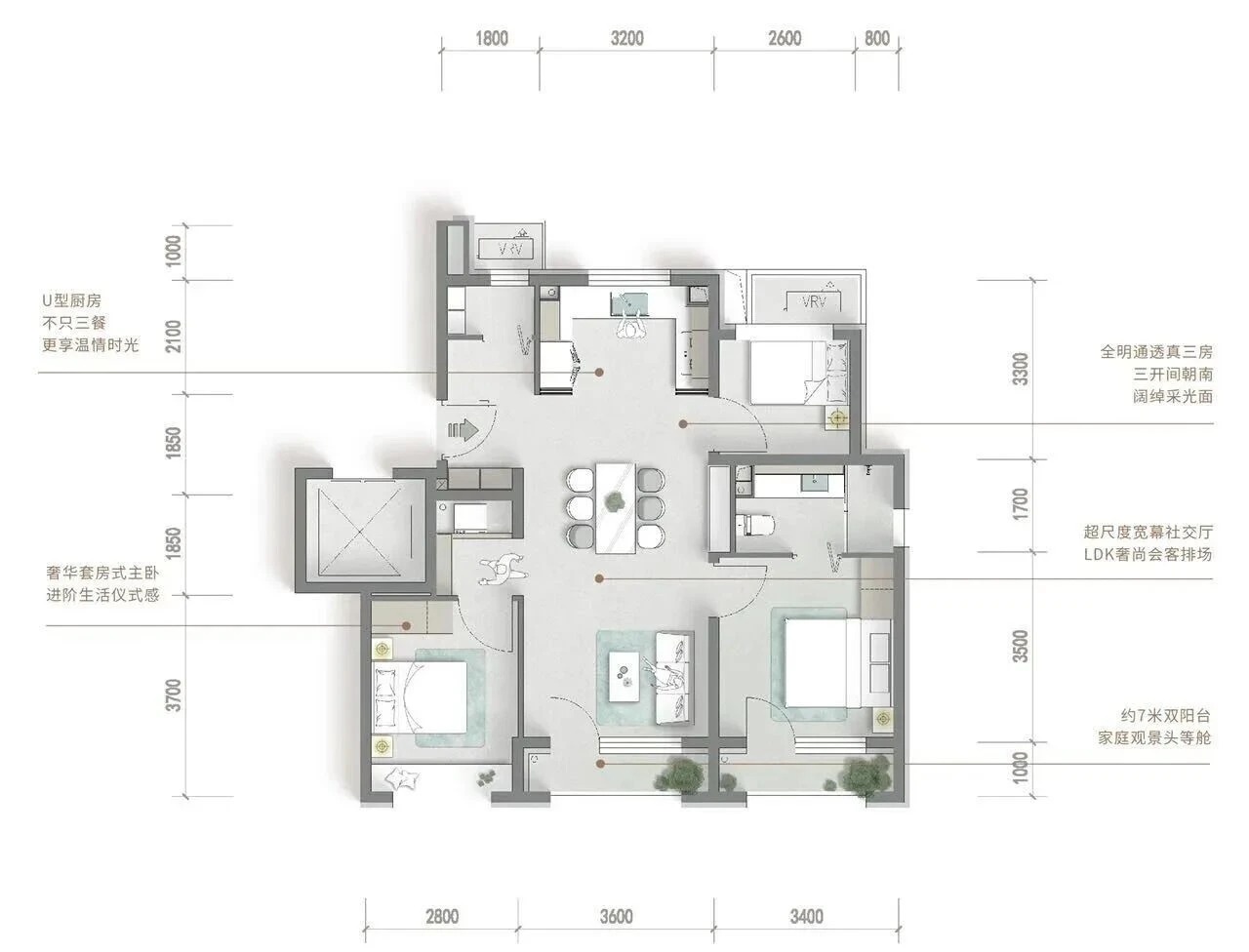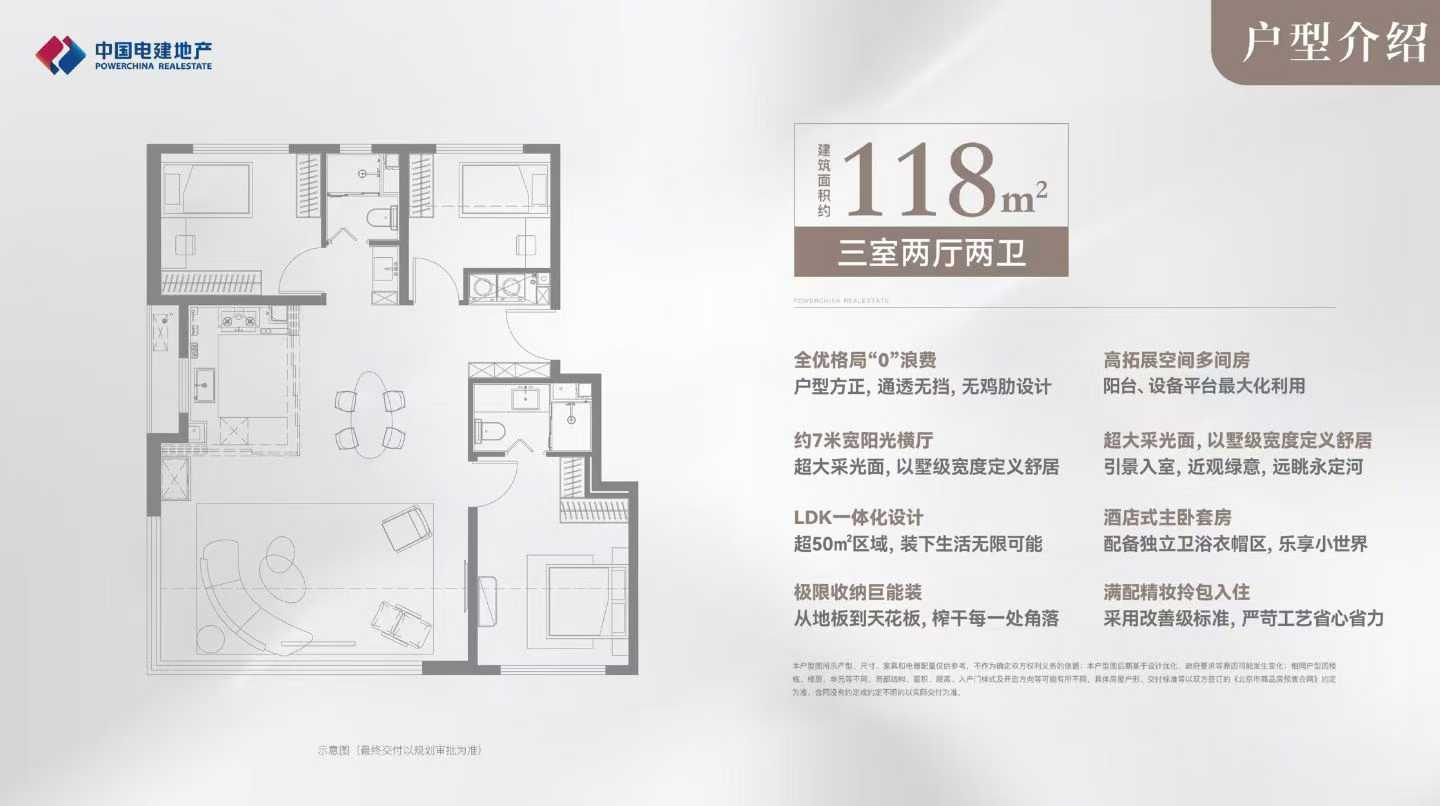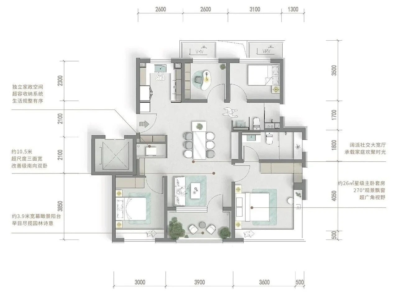 112平是做的四居室,同样是南北通透+三面宽+全明的设计,主卧做了一个超大的270°转角视野,目测黑科技蛮多的,得房率预计会很高。