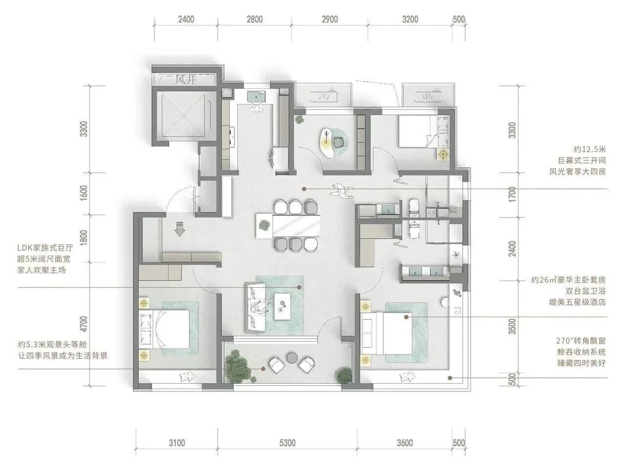 139平四居是项目的顶配户型,主卧依然是套房设计+270°转角,客厅面宽来到了5.3米,餐厅和客厅等宽,有那种豪宅大平层的视野和体验。