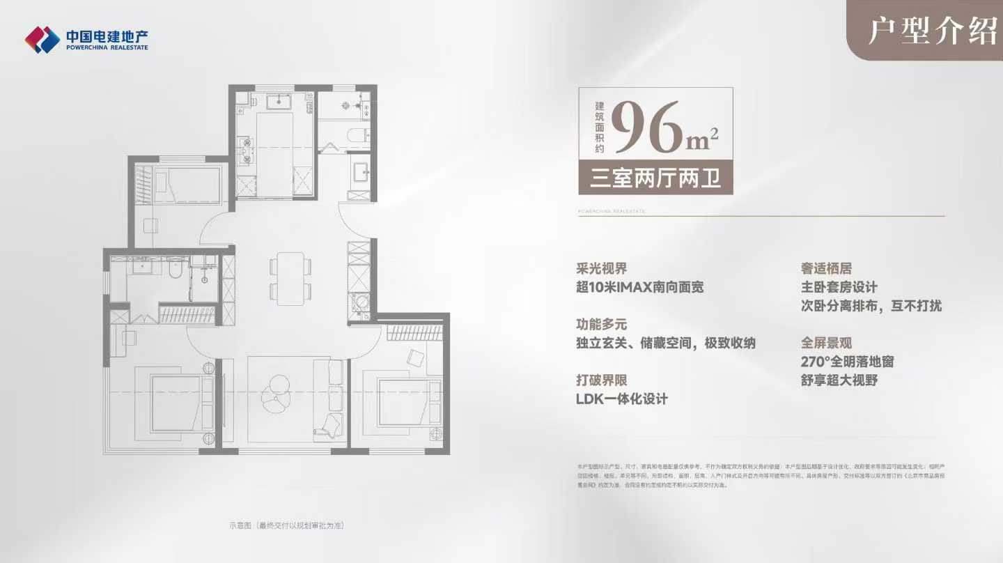 96平三居室,南北通透,南向三面宽,全明的设计,主卧套房,拥有几乎等宽的卫生间,餐厅旁还有独立家政间。