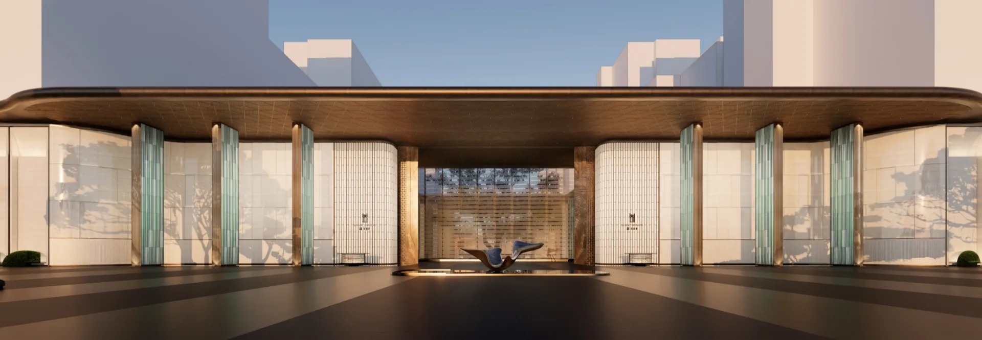 入口大门直接做了180米宽的酒店式大门,两侧还有陶板,这个档次实话实说确实是比很多10万+的盘要做的好。