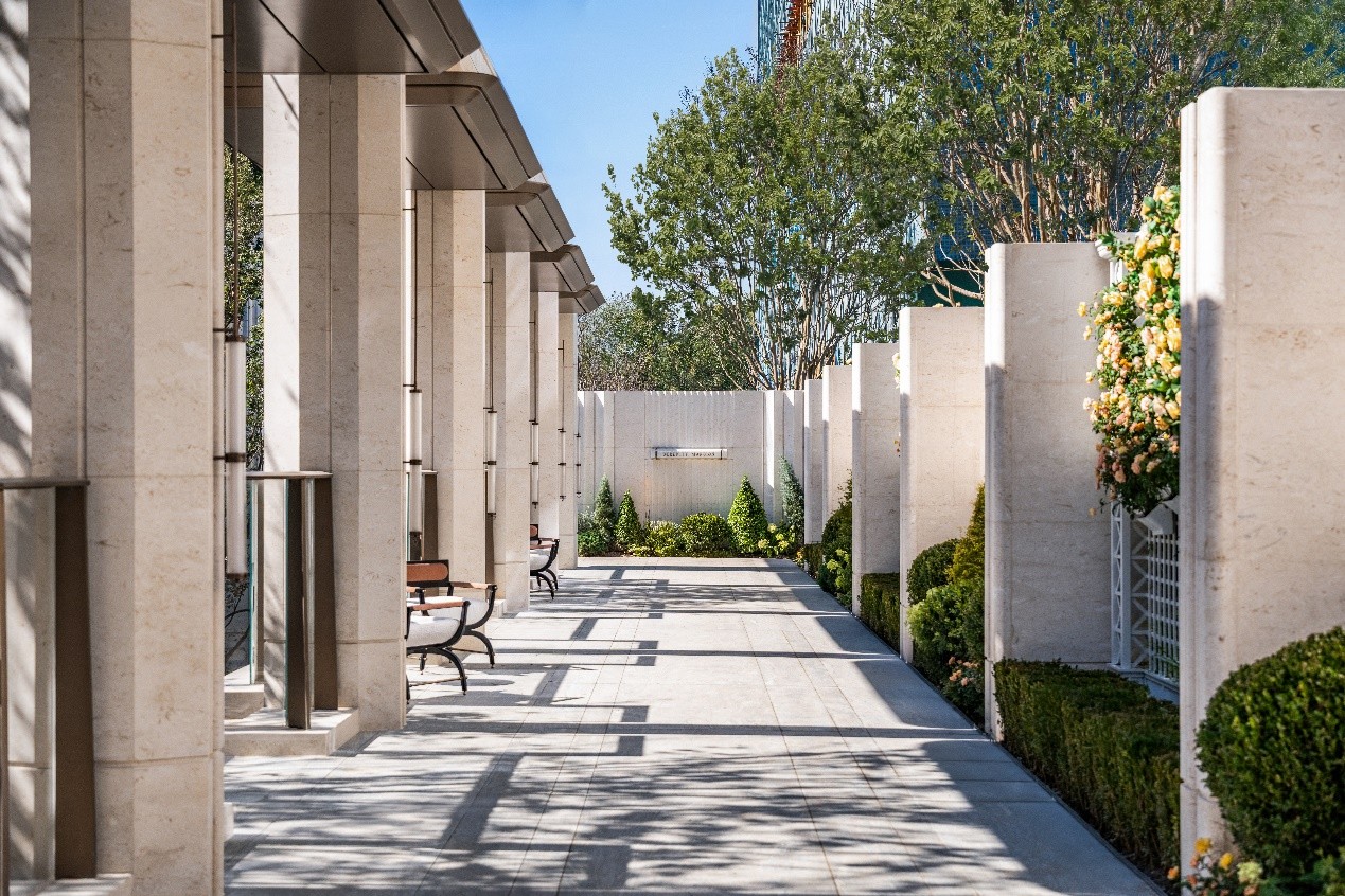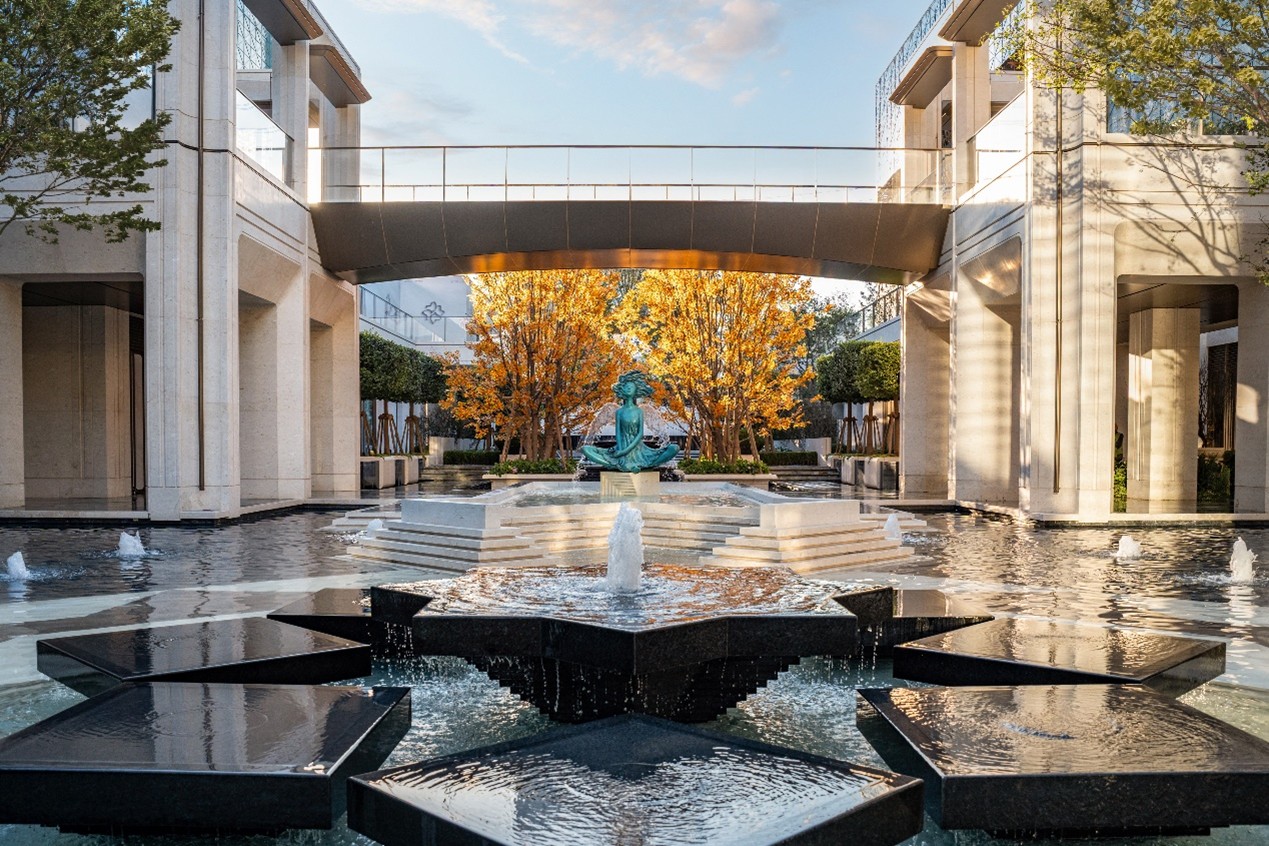 一进安和门礼,以约110米超级门面构筑威仪入口;二进安和中庭,斯卡帕叠级水景与女孩雕塑静置水畔,艺术感宁静本心;三进安和水轴,法式艺术造景过渡礼序与自然;四进安和花园,台地花园水幕静谧,浓荫私语;五进安和山荫,以奢石筑境,漫享雅致聚场;六进安和连廊,回廊哲思,观览下沉水院,俯仰皆景。