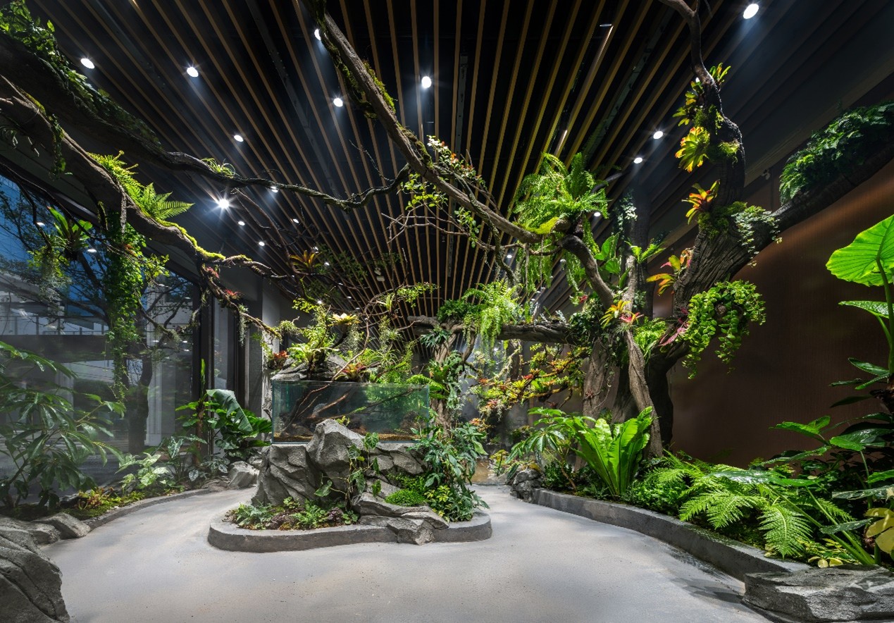 示范区借地势高差,以三级台地营造立体园林,拾阶而上,步移景异。中央水轴自西向东蜿蜒而下,水流沿台地层层跌落,静水流深,抒写兼容并蓄的人生境界。