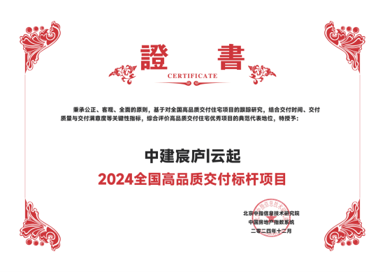 从以中建宸园、北京宸园、紫京宸园为代表的宸园产品系,到以北京国贤府、北京国贤府贰期为代表的国贤府产品系,中建智地以唐风宋韵为基底,在2023-2024年连续2年蝉联中指研究院中国房地产文化创新优秀企业TOP1。并以领衔全国的产品力,成功打造多个交付标杆作品,旗下中建宸庐|云起成功荣获中指研究院“2024全国高品质交付标杆项目”荣誉称号。
