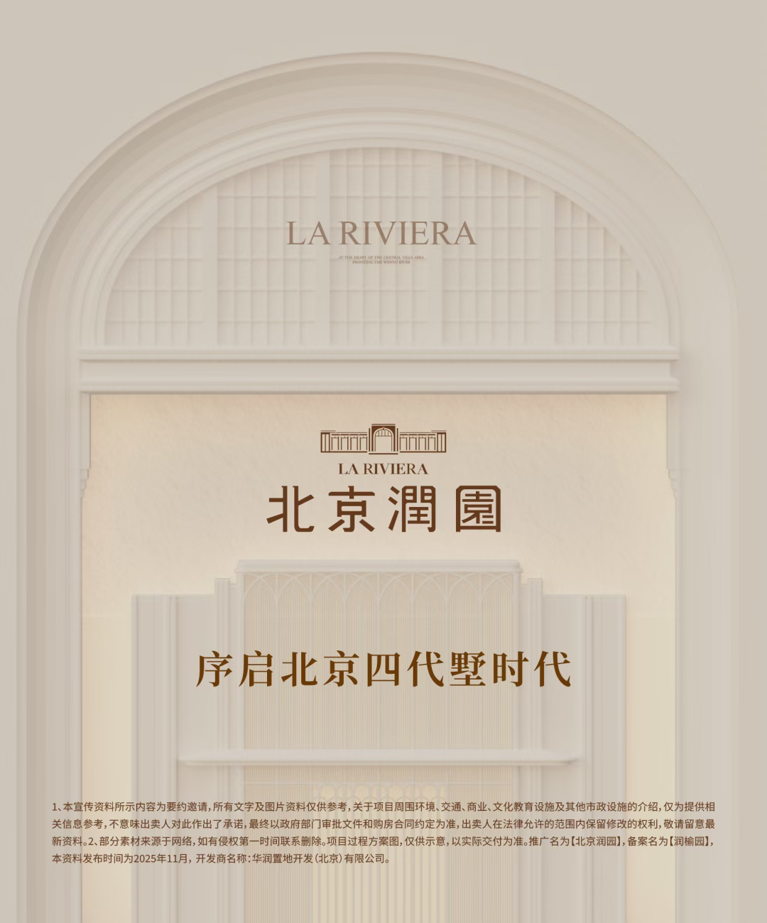 本广告仅为要约邀请,不作为确定双方权利义务的依据,双方权利义务及交房标准以商品房买卖合同的约定为准,合同对交房标准等没有约定或约定不明的以实际交付为准,本公司保留对本广告内容进行修改的权利,一切未有列举事项或更改,我司不另行通知。所有文字及图片资料仅供参考,关于项目周围环境、交通、商业、文化教育设施及其他市政设施的介绍,仅为提供相关信息参考,不意味出卖人对此作出了承诺,最终以政府部门审批文件和购房合同约定为准,出卖人在法律允许的范围内保留修改的权利,敬请留意最新资料。部分素材来源于网络,如有侵权第一时间联系删除。项目过程方案图,仅供示意,以实际交付为准。推广名为【北京润园】,备案名为【润榆园】,本资料发布时间为2025年11月, 开发商名称:华润置地开发(北京)有限公司。