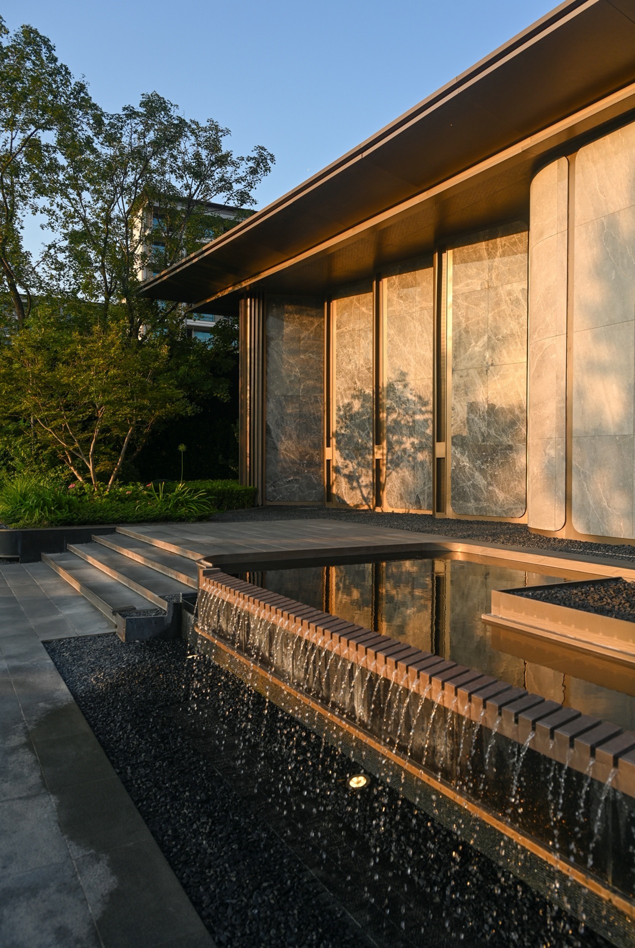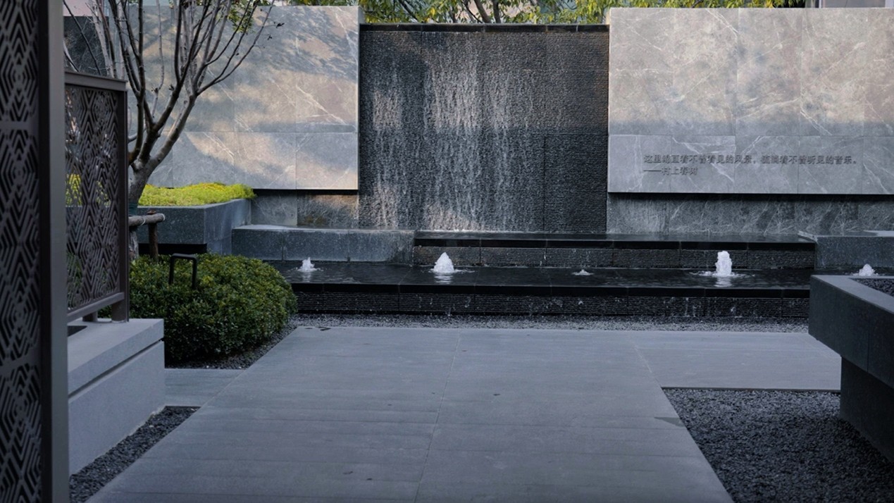 看花树间漏下的碎影,听跌水景墙轻声的和鸣,