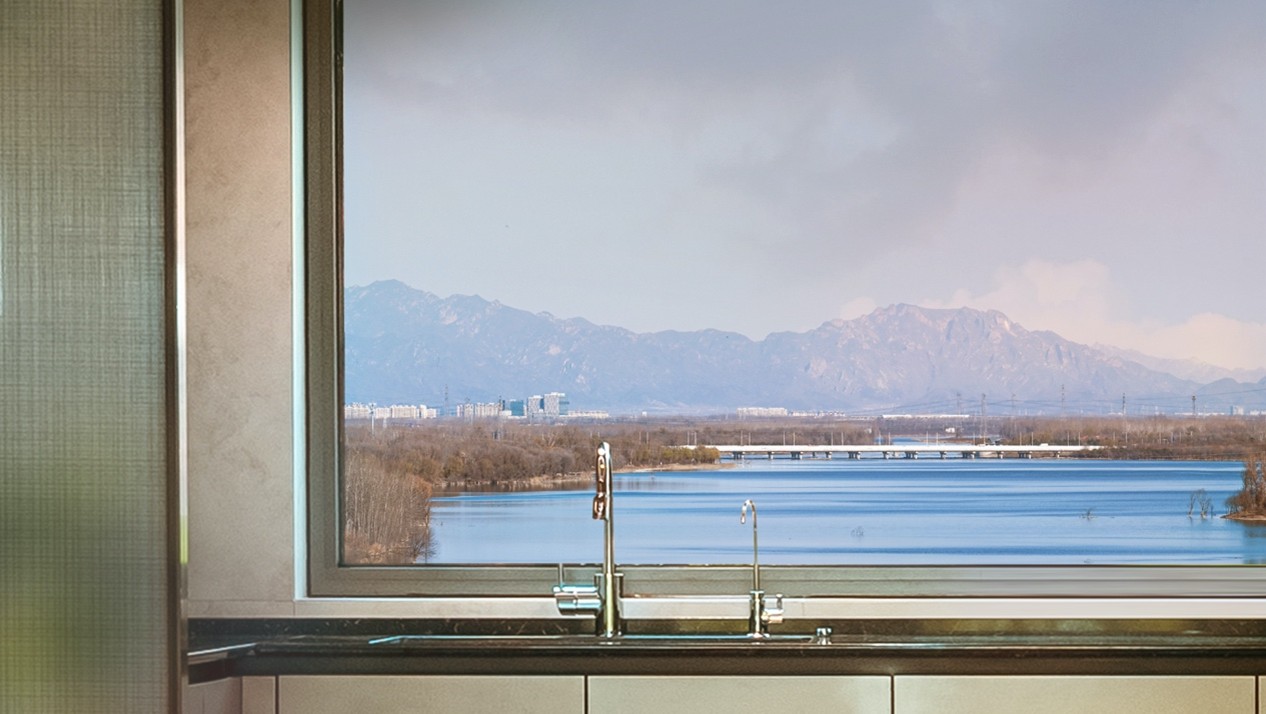 项目外窗玻璃采用三层双中空LOW-E材料,噪声隔音性能极佳,能有效隔绝临河右堤路的车流噪音。当第一缕霞光掠过水面抵达主卧观景窗,只待电动窗帘缓缓开启,潮白河的晨雾、初阳与鹭鸣便成为醒来的第一幕仪式——躺在床上,看天光云影在水面作画,看日出日落将天空染成绯红与橘黄。