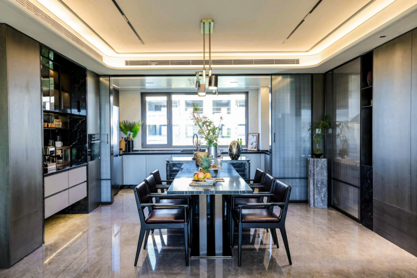 影木木饰面的温润,赋予空间雅致的亲和力;高定岩板背景墙的独特纹理,彰显着主人不凡的艺术品位;简一大板瓷砖的通铺,延伸了视觉的无界感;臻选的一线品牌厨卫与智能家居,则在看不见的地方默默呵护着舒居日常。从身体的舒悦,到内心的丰盈,每一个毛孔都能感受到被妥帖照顾的欢愉。