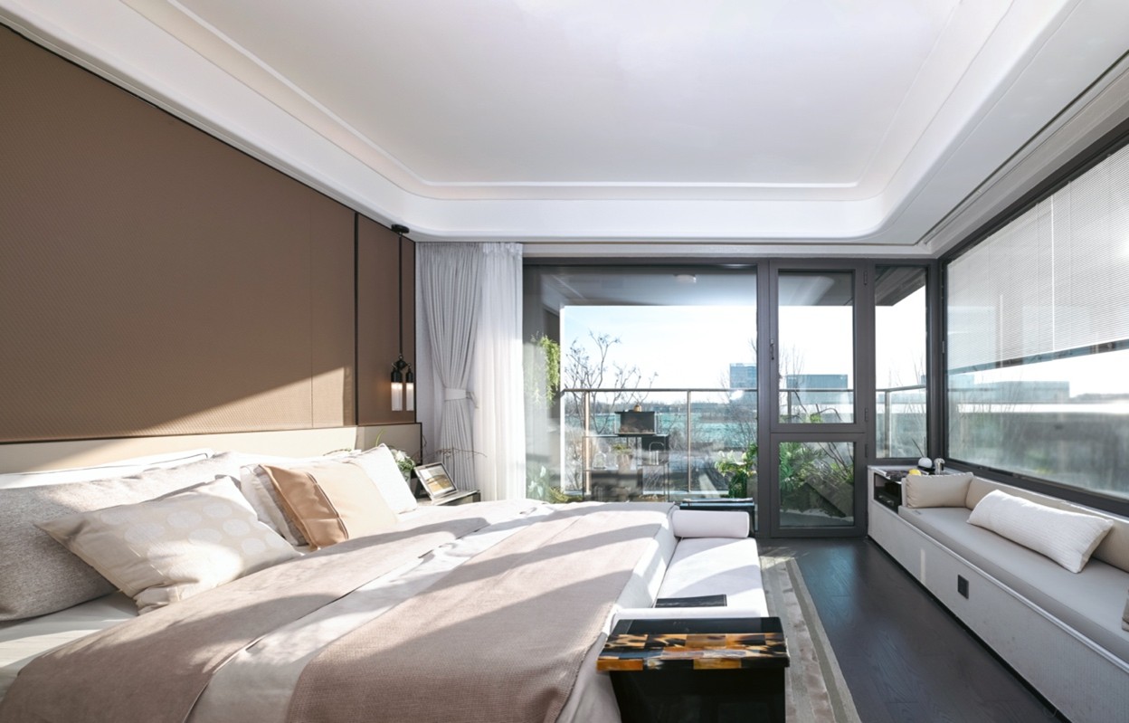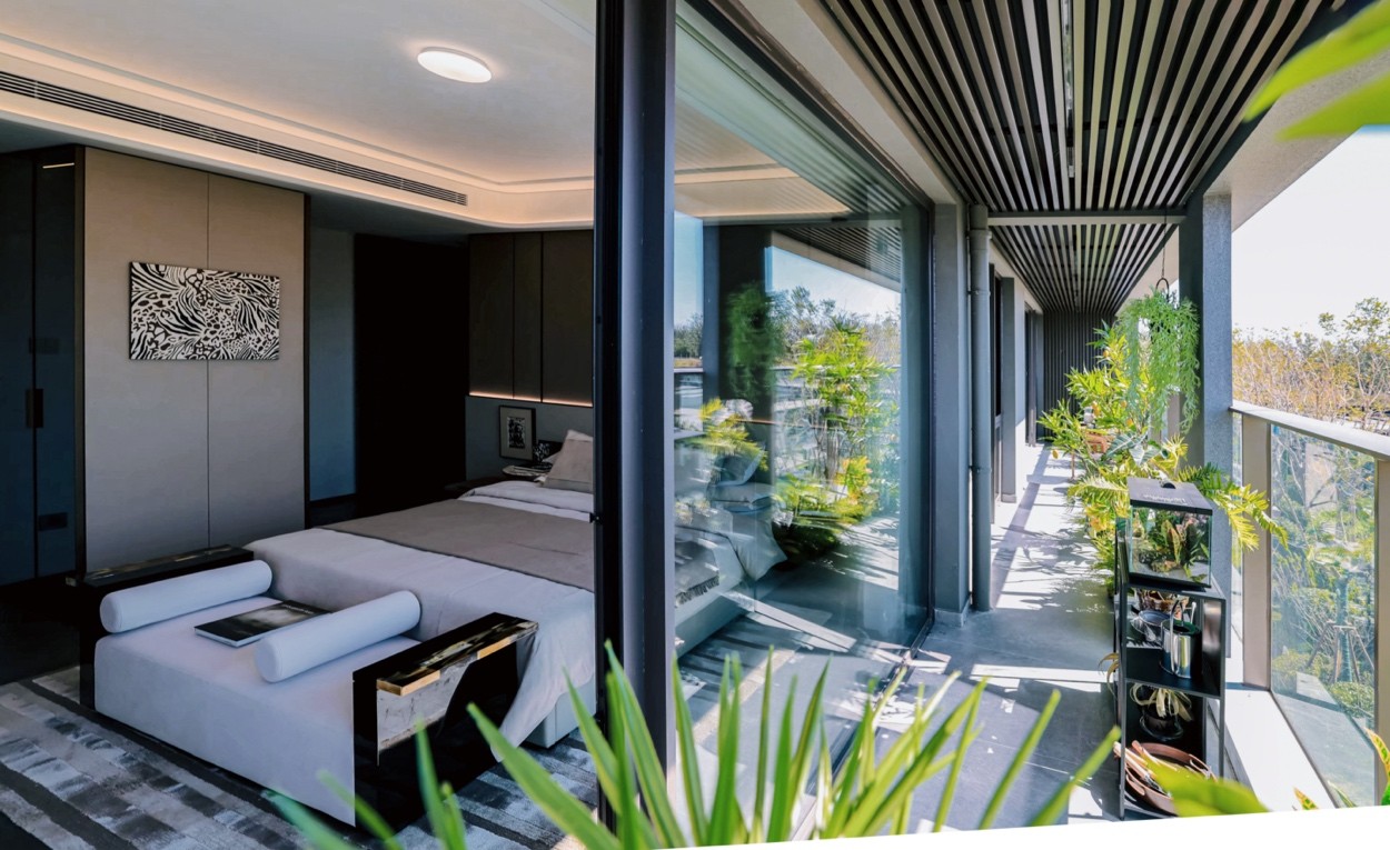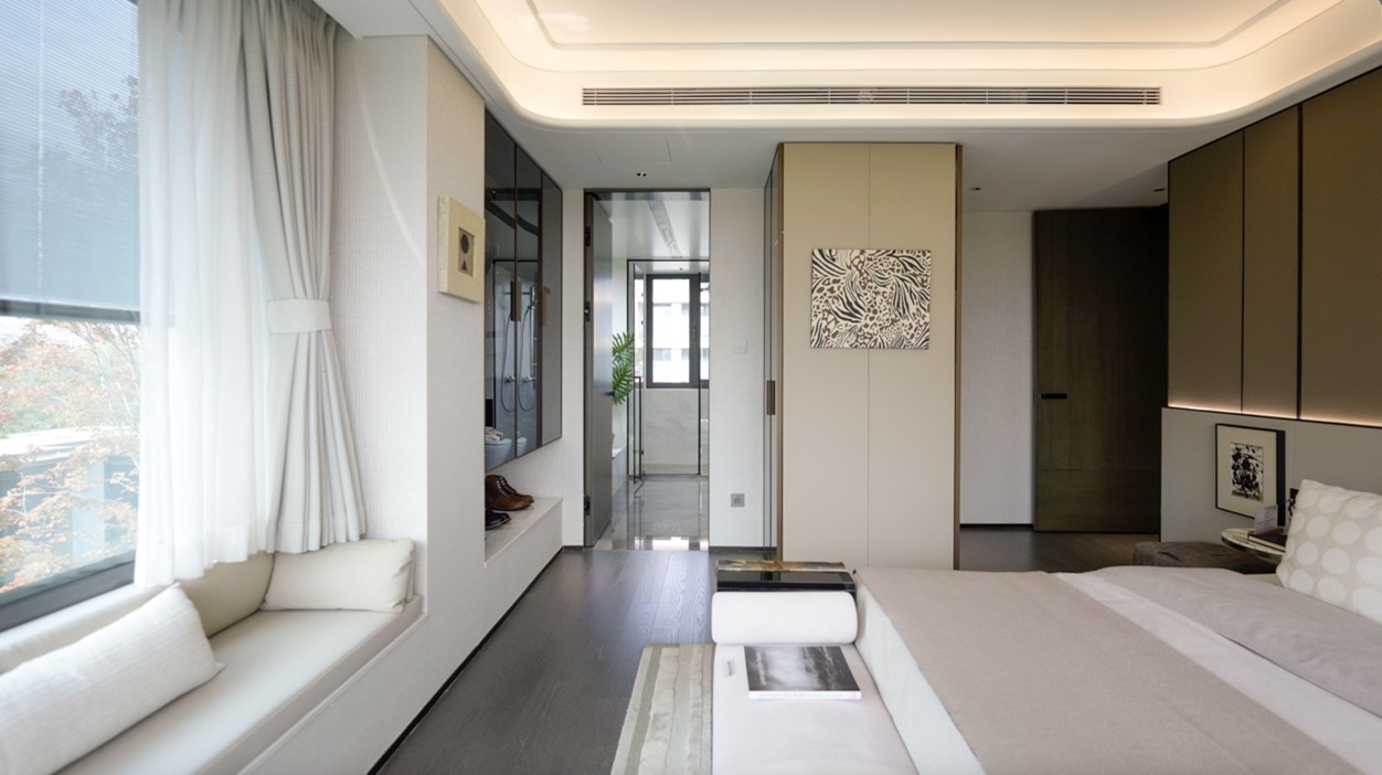 约15.1米南向四面宽,带来IMAX级宽幕采光。在此之上,三卧室朝南格局,均做到了南北通透,主卧、长辈房、儿童房同享清风穿堂、阳光满盈,家人的居住舒适度都被认真对待。主卧270°转角飘窗(端户)+观景卫浴设计,进一步优化了采光与通风,让空间更显通透舒畅。