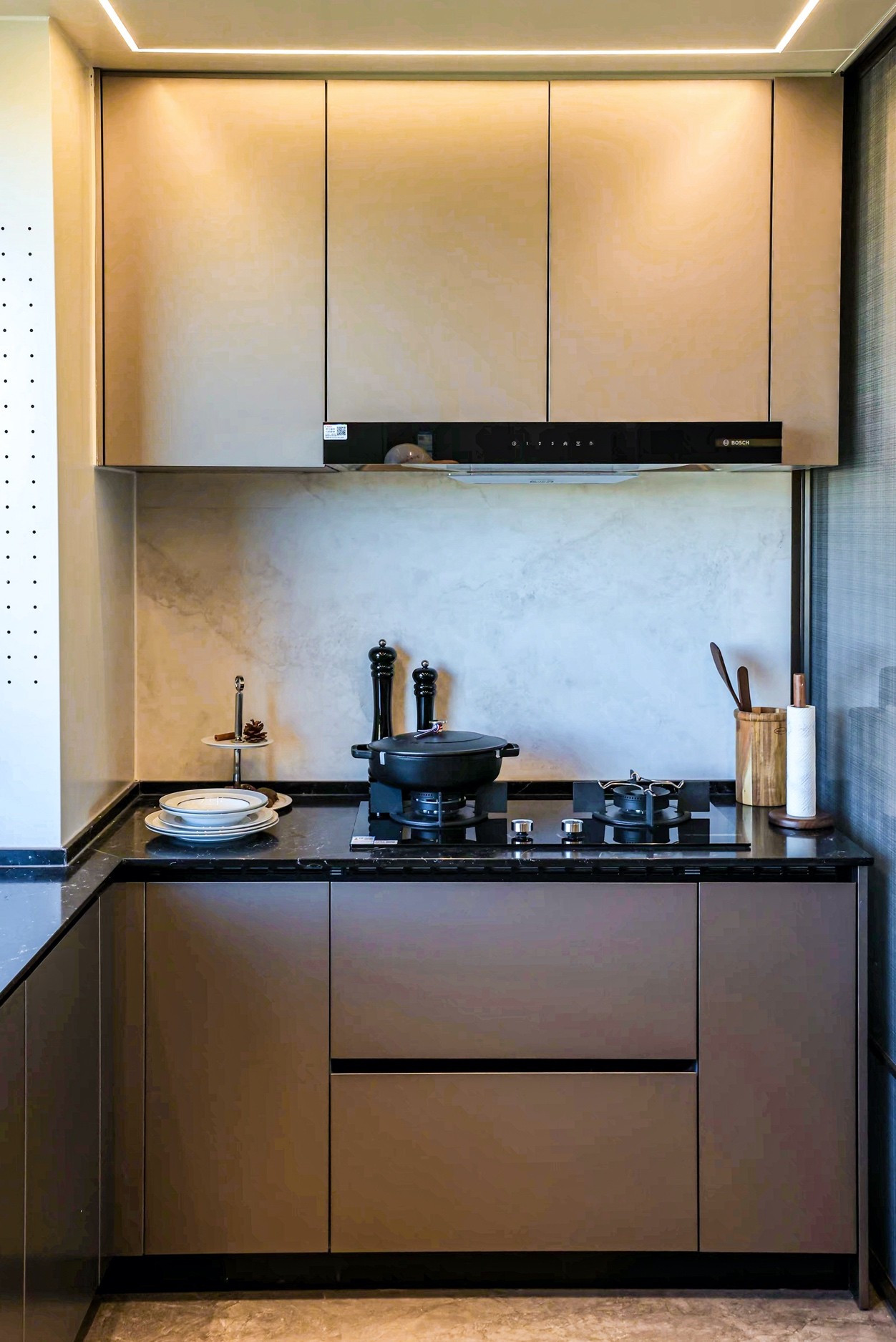 约5米宽厅延伸,餐客厨等宽设计,打破空间壁垒,厨房的烹煮烟火、餐厅的摆盘仪式、客厅的欢聚时光无界衔接,家人闲话家常、亲友小聚畅谈、孩子嬉戏打闹,都能在这片等宽的空间里从容上演,构筑家庭亲密互动社交的尽欢生活场。