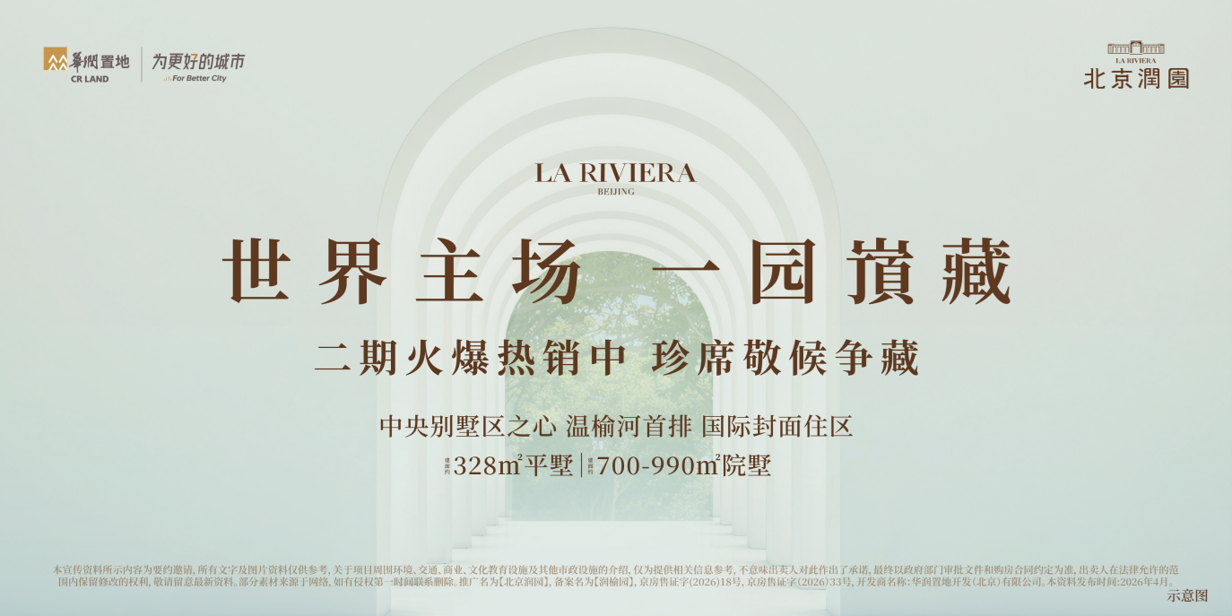 本宣传资料所示内容为要约邀请,所有文字及图片资料仅供参考。本宣传资料仅是对户型结构、功能、布局的示意,仅供客户参考,不作为交付标准,实际交付标准以买卖双方签订的《商品房买卖合同》及其附图约定为准。推广名为【北京润园】,备案名为【润榆园】,预售证号: 京房售证字(2026)18号、京房售证字(2026)33号,开发商名称:华润置地开发(北京)有限公司。本资料发布时间:2026年4月。