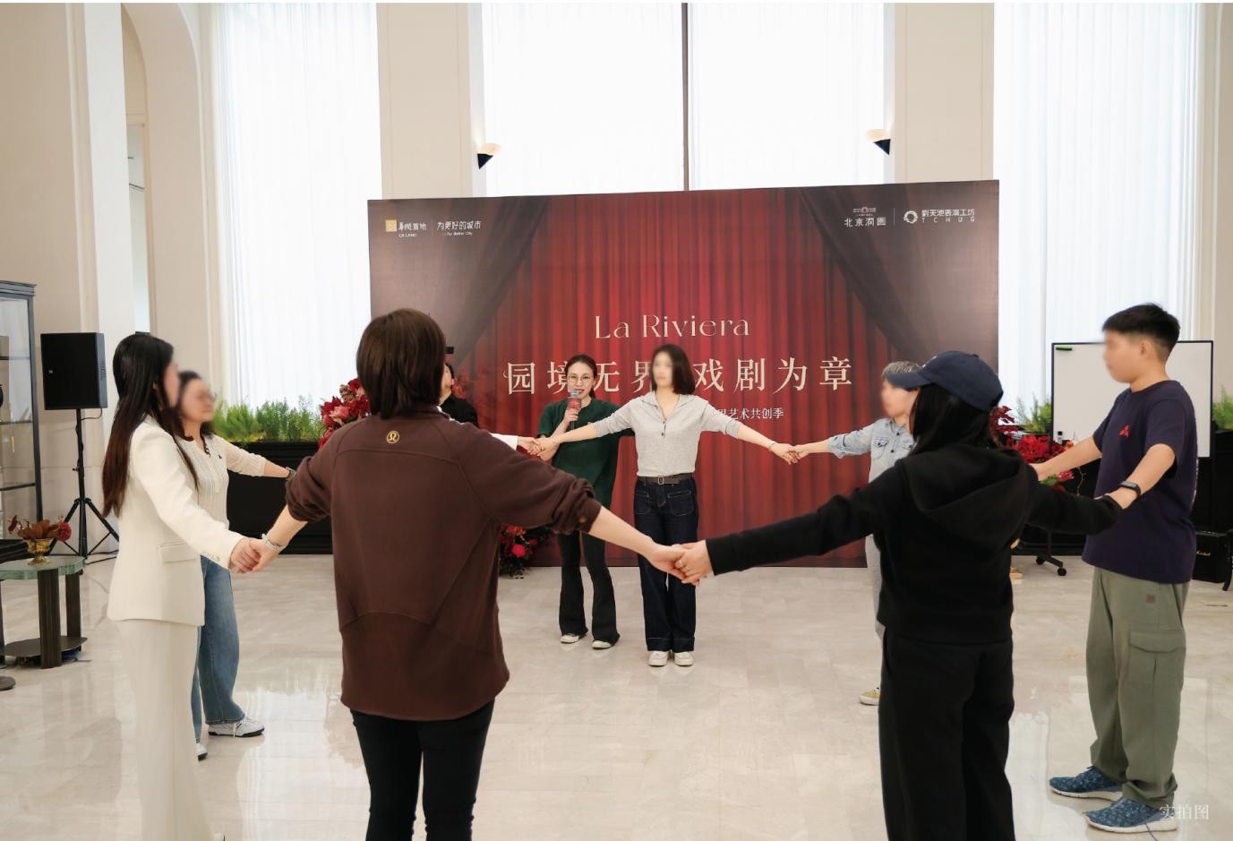 沙龙现场,北京润园“戏剧表演社”同步启幕,为邻里社群注入艺术新活力。在刘天池老师及工坊专业教师田野的引导下,业主们放下日常身份,通过呼吸、声音与即兴形体练习,感受以肢体为语的心意相通。轻声台词在空间流转,协同动作建立无声默契,别墅会客厅成为灵感交融的场域。此刻,艺术不再是远观的风景,而是可参与、可共创的即兴体验。